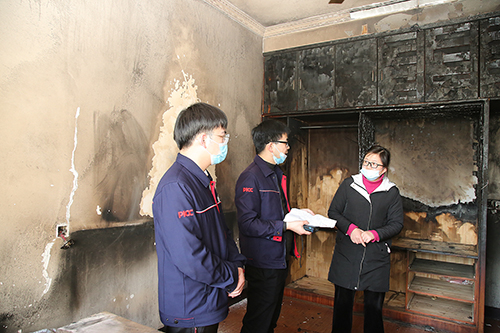 日前,浙江省海盐县武原街道首荡社区农户冯某刚装修不久的婚房遭遇火灾,损失惨重。接到报案后,人保财险浙江海盐支公司理赔人员立即赶往冯某家中,迅速查勘现场,详细了解火灾事故的起因、施救过程,认真核实财产损失情况,并向冯某说明理赔流程。此外,考虑到冯某急需资金修缮房屋和室内装修,该公司为其开辟“绿色通道”,简化流程,快速定损,确保在一周内结案,并兑现赔款。图为该公司工作人员在冯某家中进行现场勘察。