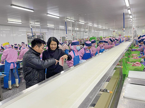 广东省茂名鸿业水产有限公司是化州市一家经营罗非鱼等水产品加工生产销售及饲料生产销售的企业,产品以出口为主。为提高罗非鱼亩产量及产品质量,企业前期对罗非鱼养殖饲料投入了大量的研究和试产,造成罗非鱼收购旺季流动资金不足。邮储银行化州市支行了解情况后,及时为企业发放了科技型中小企业流动资金信用贷款500万元,后增信至1500万元,有效解决了企业流动资金短缺问题,有力地支持企业转型升级、做大做强。图为邮储银行化州市支行客户经理走访了解茂名鸿业水产有限公司罗非鱼加工情况。 (吴诗茵)