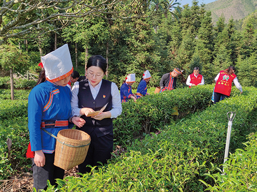 近年来,广西金秀农商银行依托金秀县丰富的自然资源,重点支持“一村一品、一乡一业”特色产业发展,运用金融力量激发农村活力,满足乡村产业发展需求。截至目前,该行累计发放贷款资金8000万元用于支持茶叶种植,累计发放10120万元贷款资金用于发展中草药种植。图为该行信贷员在金秀县六段村茶叶种植示范基地向茶农讲解金融产品。