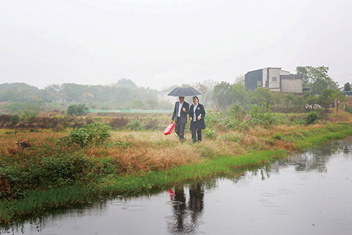 图为该行金融村官冒雨深入田间地头走访农户