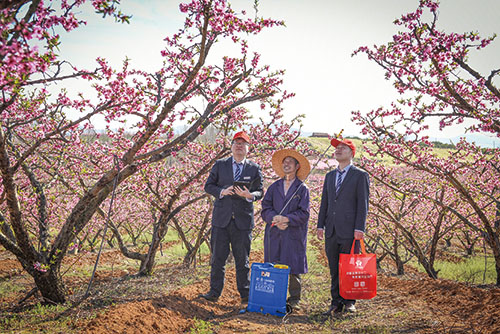 湖北枣阳农商银行大力开展村银共建,委派金融人员、实施整村授、定制专属贷款。近年来该行累计投放贷款10.62亿元,为枣阳市30万亩桃园注入金融活水,有力支持了“桃经济”全产业链发展。图为枣阳农商银行工作人员在平林镇四井岗村回访桃农。