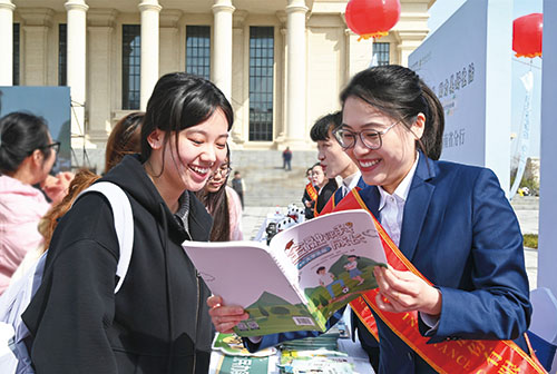 近日,农银人寿河南分公司协同中国农业银行河南省分行、河南农业大学主办的金融消费者权益保护教育宣传活动,走进河南农业大学校园,构建“教育+实践”宣传闭环,向青年学子传递金融安全“必修课”,助力他们练就识诈“火眼金睛”,切实守护好个人“金融人生”。图为该分公司工作人员向学生宣讲金融消保相关知识。